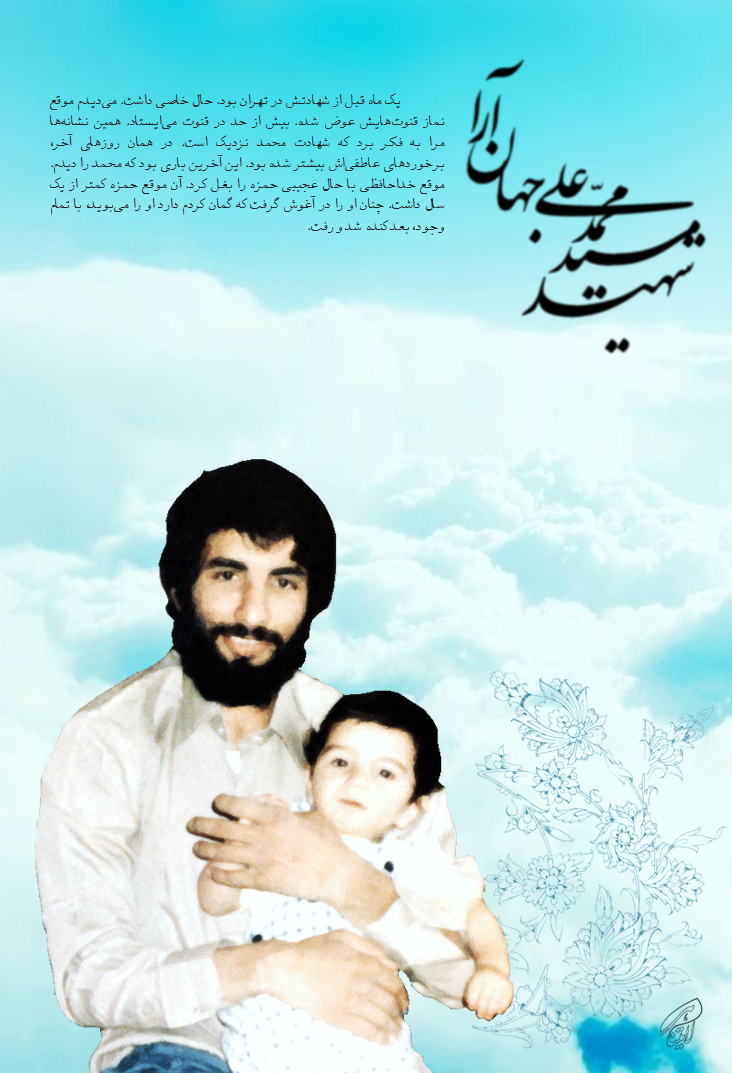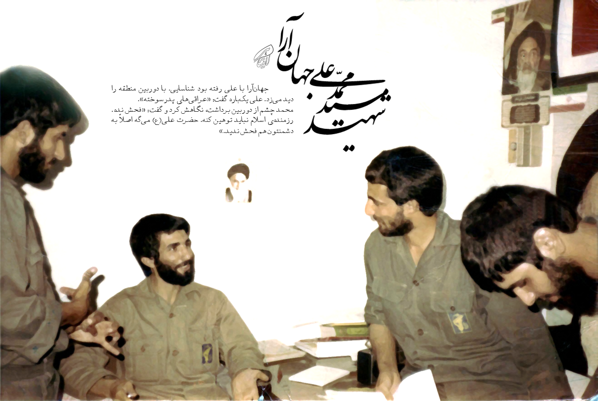 3) پیوند جهانآرا و خرمشهر بهنظر من به علت علاقه زیادی بود که محمد به خرمشهر داشت. جهانآرا میگفت: مردم خرمشهر مظلوم واقع شدهاند. به آنها کمکی نشد. تجهیزاتی نیامد. آنان از دل و جان نیرو گذاشتند. جهانآرا میگفت: من بعضی از شبها جسد بچههای خرمشهر را میبینم که توسط سگها تکهپاره میشود، ولی ما نمیتوانیم از سنگرها و پناهگاهها خارج شویم و این جنازهها را نجات دهیم. شب و روز جهانآرا خرمشهر بود. از روزی که عراق به خرمشهر هجوم آورد، محمد همّ خود را وقف جنگ کرد. (به نقل از همسر شهید)